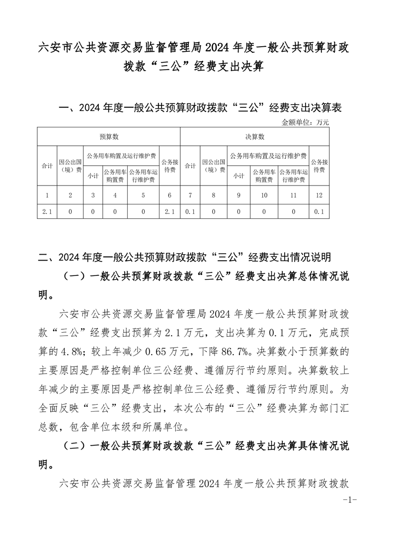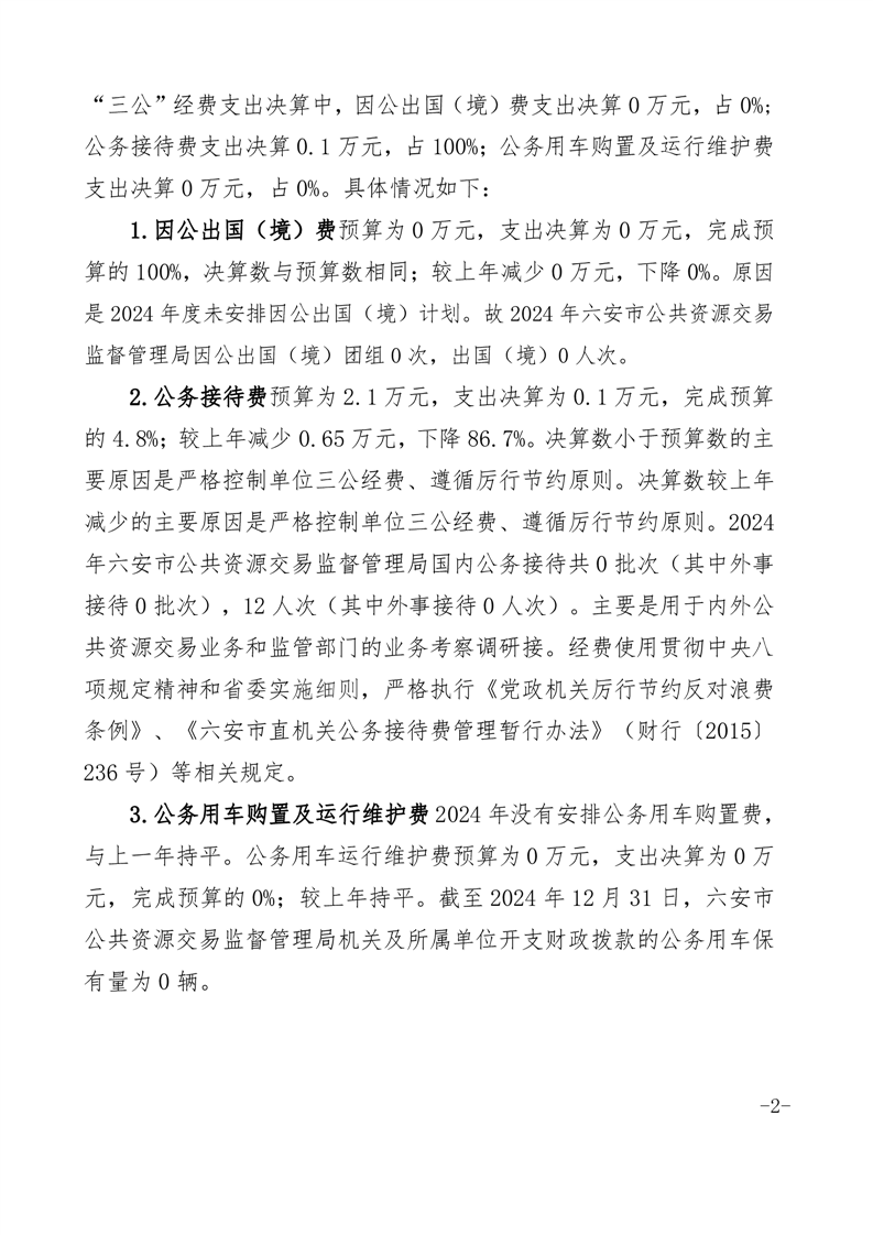 六安市公共资源交易监督管理局2024年度一般公共预算财政拨款“三公”经费支出决算