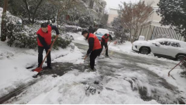 志愿者们身穿红马甲,手持铁锹,迅速投入到清雪除冰工作。有人挥锹破冰,有人协力铲雪,默契配合着推进作业。凛冽寒风里,大家干得热火朝天,纷纷解开上衣领口透气,额角的汗珠刚冒出来,就在冷风中凝成了细碎的霜花,却没人停下手中的动作。2小时后,单元楼入口的积雪被全部清理干净,一条安全通畅的出行通道呈现在居民眼前。